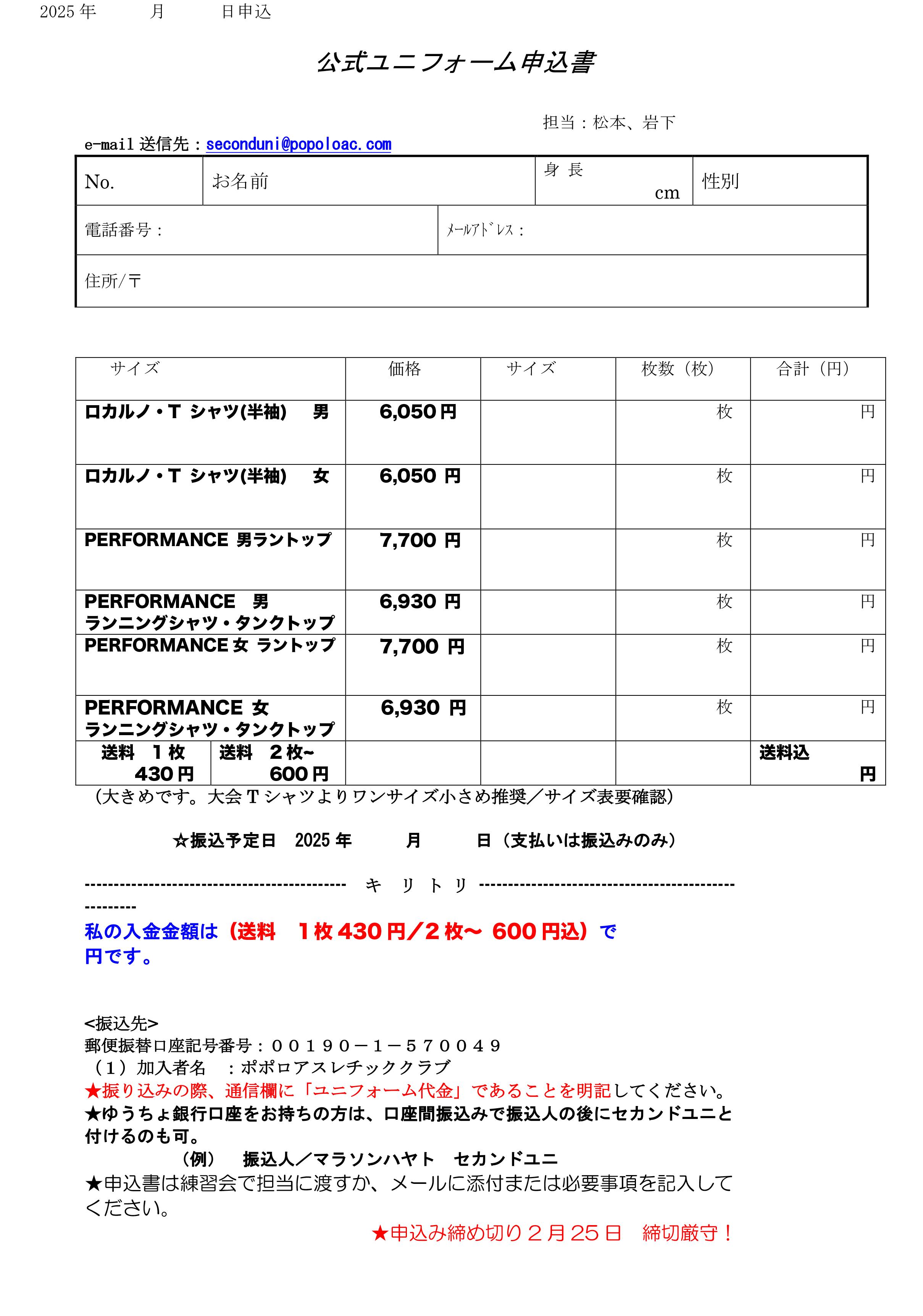 購入希望者は添付の申込用紙をダウンロードし、必要事項を記入の上、練習会でユニフォーム担当に渡すか、メール(seconduni@popoloac.com )に申込書を添付してお申し込みください。