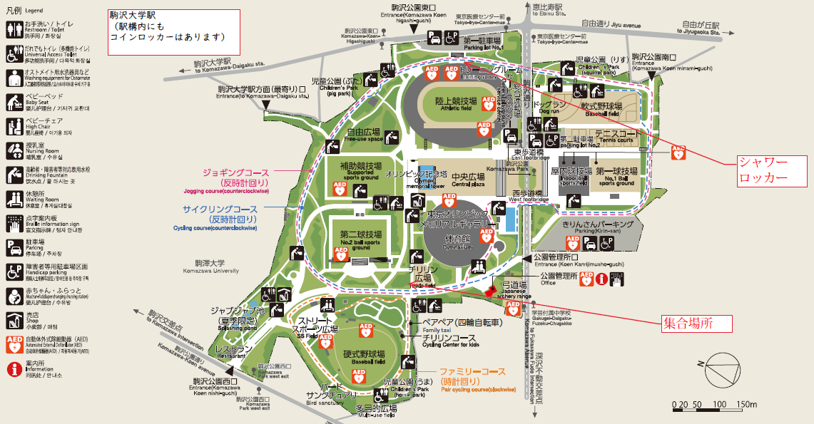 なお駒沢公園は多くのランナーや歩行者がいます。皇居よりは観光の人がいない分走りやすいとは思いますが、走行の際はくれぐれも接触など起こさないよう気を付けて走行ください。特に100m地点の左折するところは自転車道を横切ること、400m過ぎは細くなっていることから特に注意し、危険を感じたらペースよりも安全優先で減速など対応をお願いします。